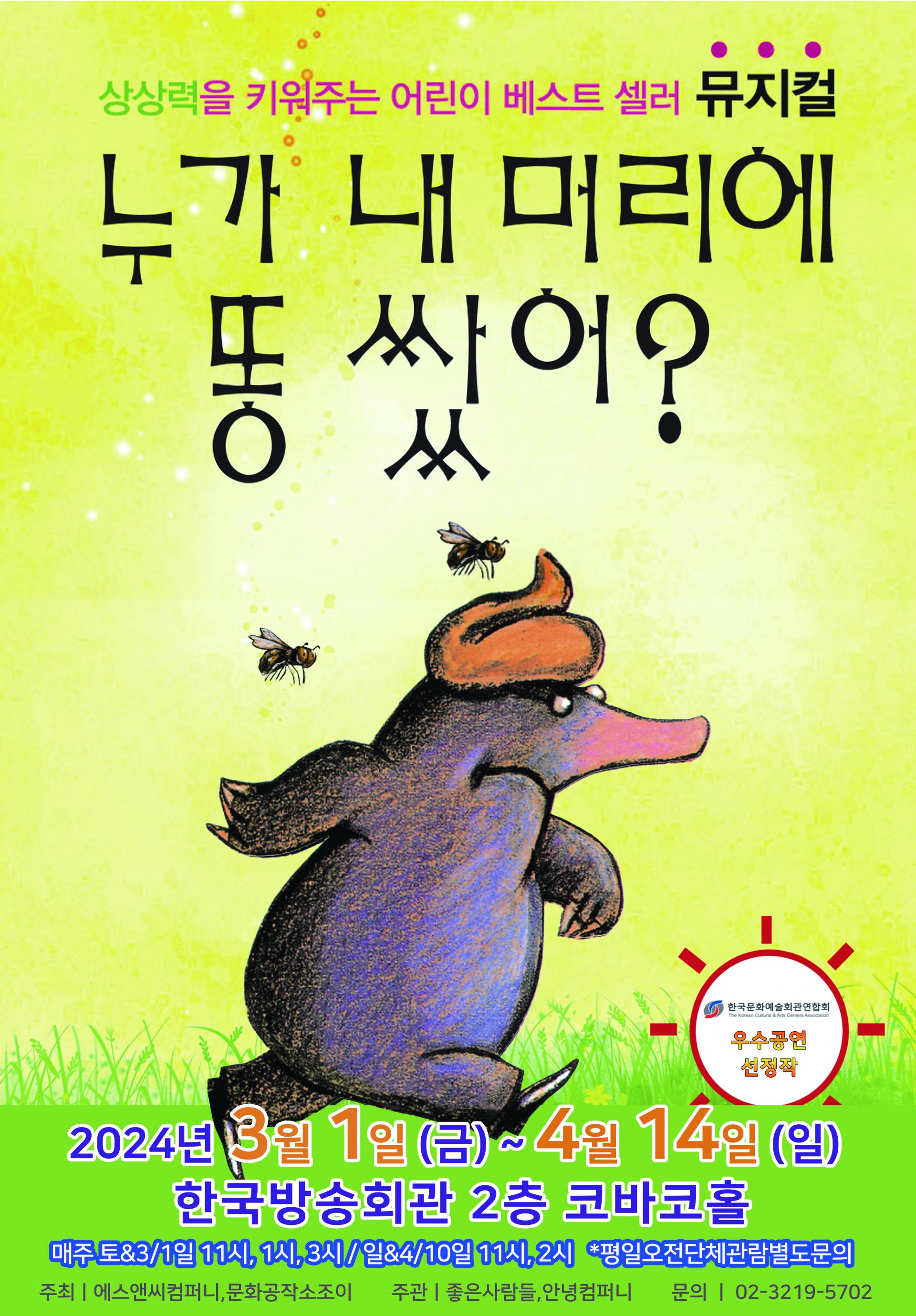 <2024년 3,4월 공연> 어린이베스트셀러뮤지컬 <누가 내머리에 똥쌌어?> 예매처 안내